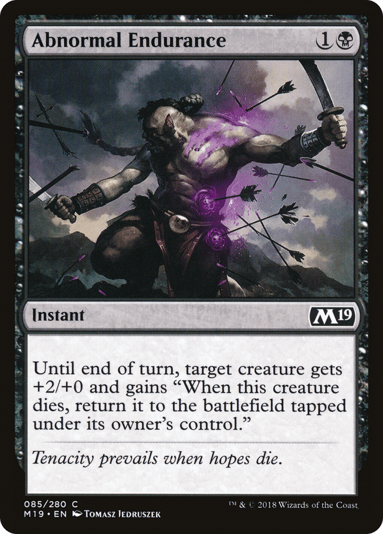 Until end of turn, target creature gets +2/+0 and gains “When this creature dies, return it to the battlefield tapped under its owner’s control.”