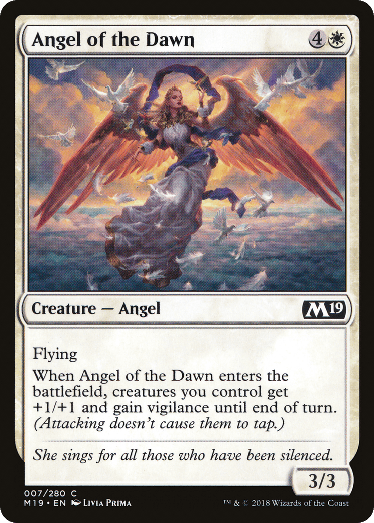 Flying When this creature enters, creatures you control get +1/+1 and gain vigilance until end of turn.