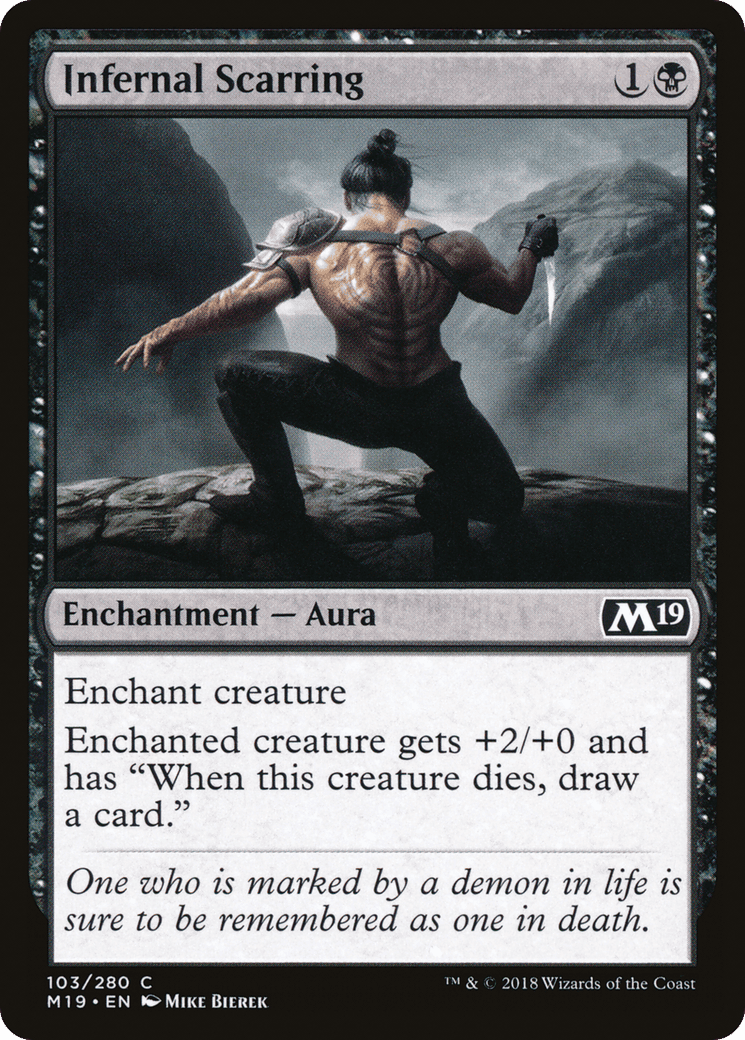 Enchanted creature gets +2/+0 and has “When this creature dies, draw a card.”