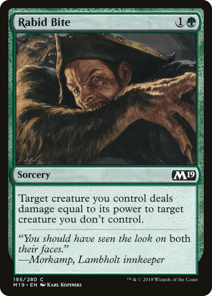 Target creature you control deals damage equal to its power to target creature you don’t control.