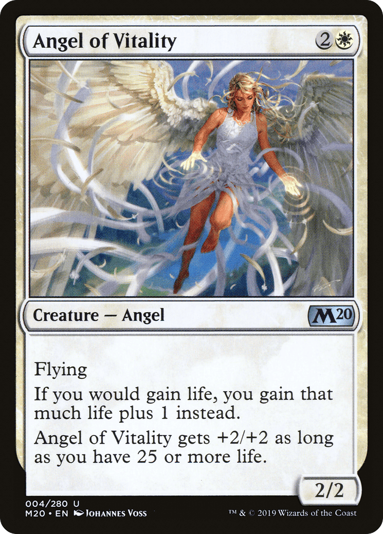 Flying If you would gain life, you gain that much life plus 1 instead. This creature gets +2/+2 as long as you have 25 or more life.
