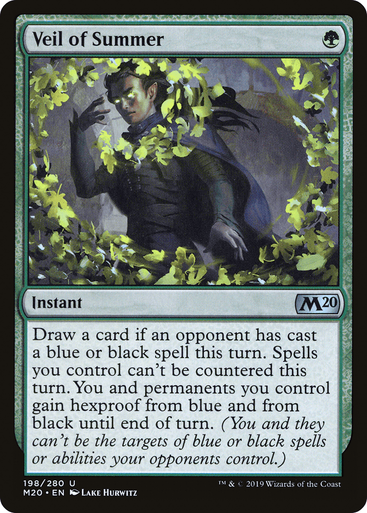 Draw a card if an opponent has cast a blue or black spell this turn. Spells you control can’t be countered this turn. You and permanents you control gain hexproof from blue and from black until end of turn. (You and they can’t be the targets of blue or bl