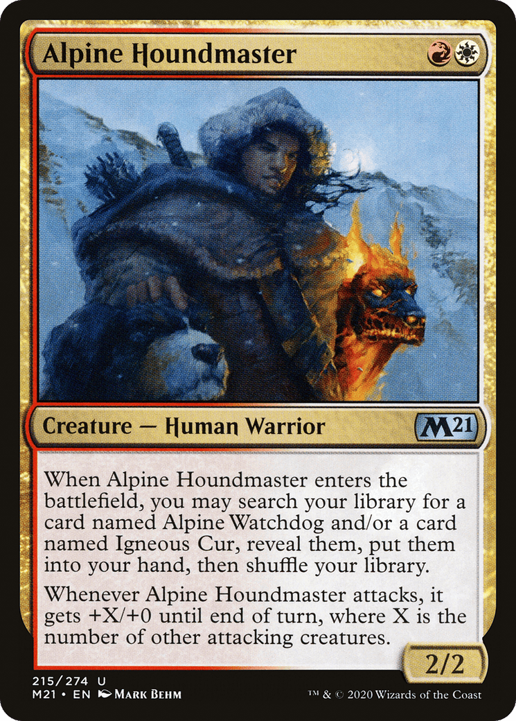 When this creature enters, you may search your library for a card named Alpine Watchdog and/or a card named Igneous Cur, reveal them, put them into your hand, then shuffle.
