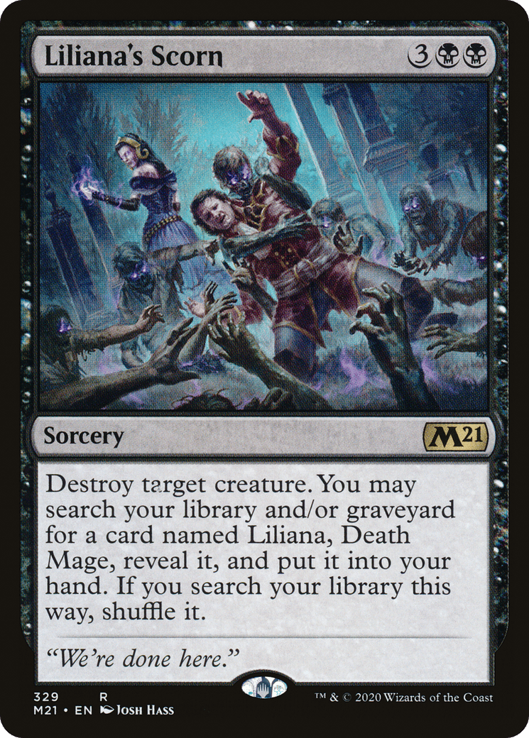 Destroy target creature. You may search your library and/or graveyard for a card named Liliana, Death Mage, reveal it, and put it into your hand. If you search your library this way, shuffle.