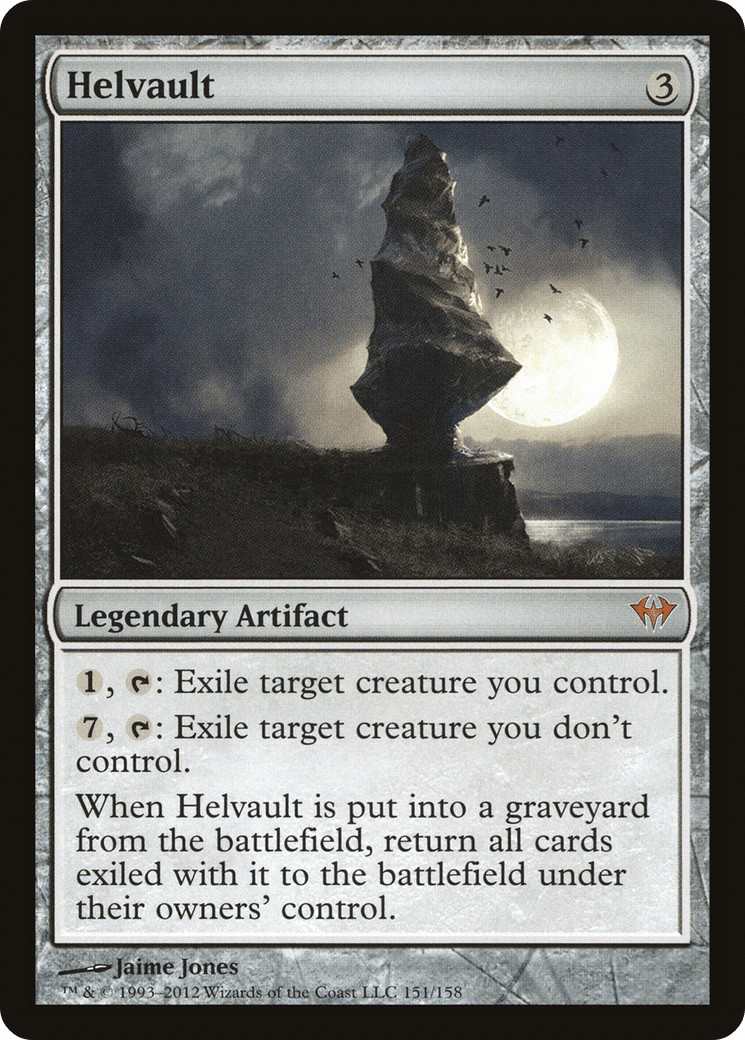 When Helvault is put into a graveyard from the battlefield, return all cards exiled with it to the battlefield under their owners’ control.