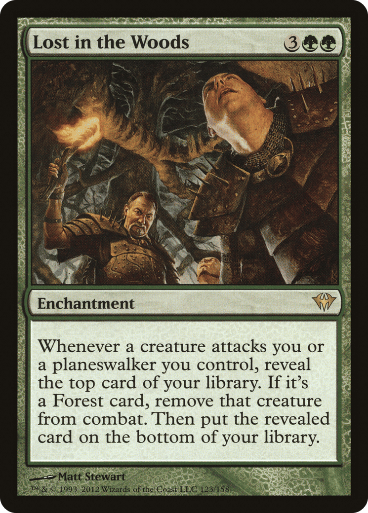 Whenever a creature attacks you or a planeswalker you control, reveal the top card of your library. If it’s a Forest card, remove that creature from combat. Then put the revealed card on the bottom of your library.