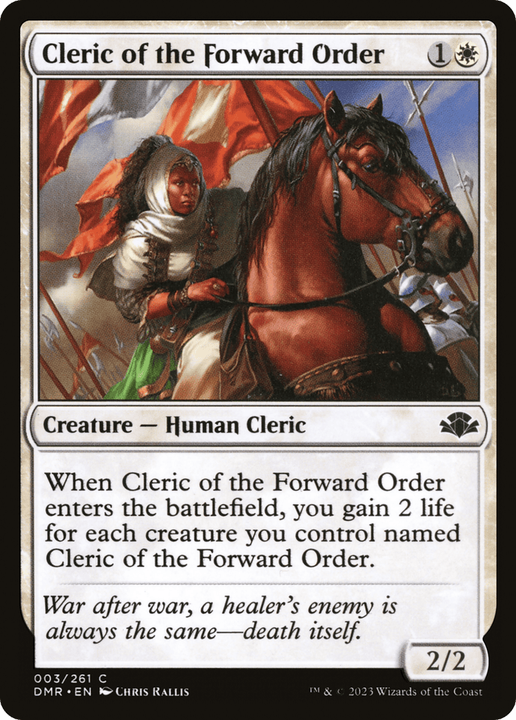 When this creature enters, you gain 2 life for each creature you control named Cleric of the Forward Order.