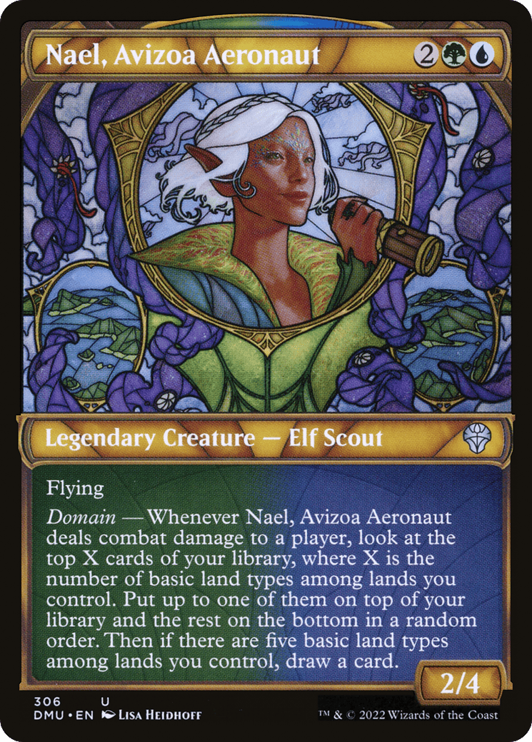 Domain – Whenever Nael deals combat damage to a player, look at the top X cards of your library, where X is the number of basic land types among lands you control. Put up to one of them on top of your library and the rest on the bottom in a random