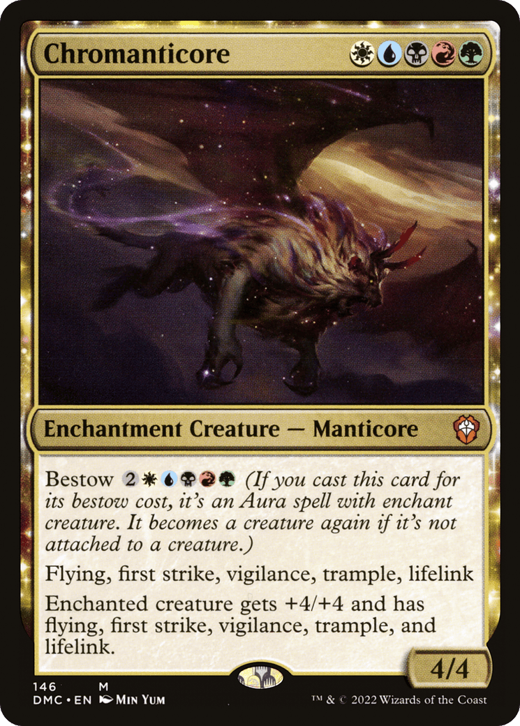 Bestow {2}{W}{U}{B}{R}{G} (If you cast this card for its bestow cost, it’s an Aura spell with enchant creature. It becomes a creature again if it’s not attached to a creature.)