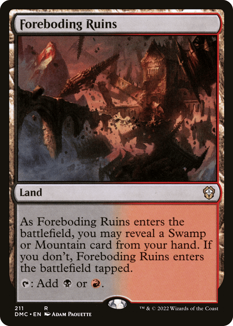 As this land enters, you may reveal a Swamp or Mountain card from your hand. If you don’t, this land enters tapped. {T}: Add {B} or {R}.