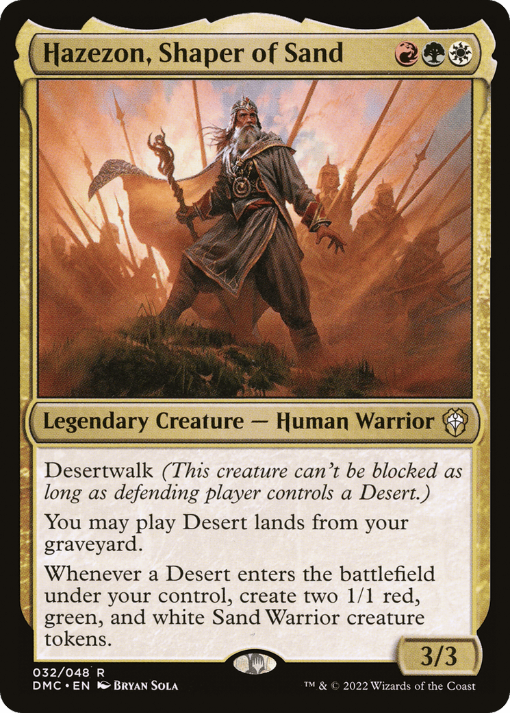 Whenever a Desert you control enters, create two 1/1 red, green, and white Sand Warrior creature tokens.