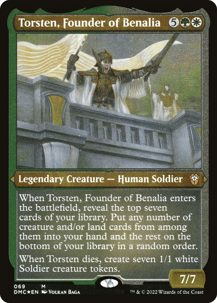 When Torsten enters, reveal the top seven cards of your library. Put any number of creature and/or land cards from among them into your hand and the rest on the bottom of your library in a random order.