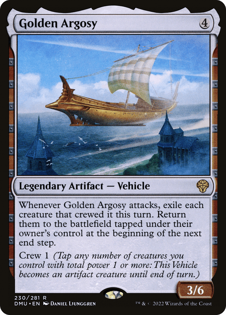 Whenever Golden Argosy attacks, exile each creature that crewed it this turn. Return them to the battlefield tapped under their owner’s control at the beginning of the next end step.