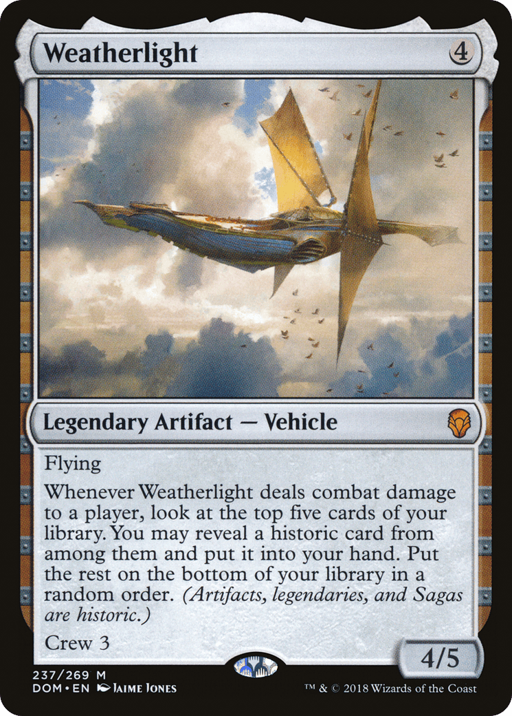Whenever Weatherlight deals combat damage to a player, look at the top five cards of your library. You may reveal a historic card from among them and put it into your hand. Put the rest on the bottom of your library in a random order. (Artifacts, l