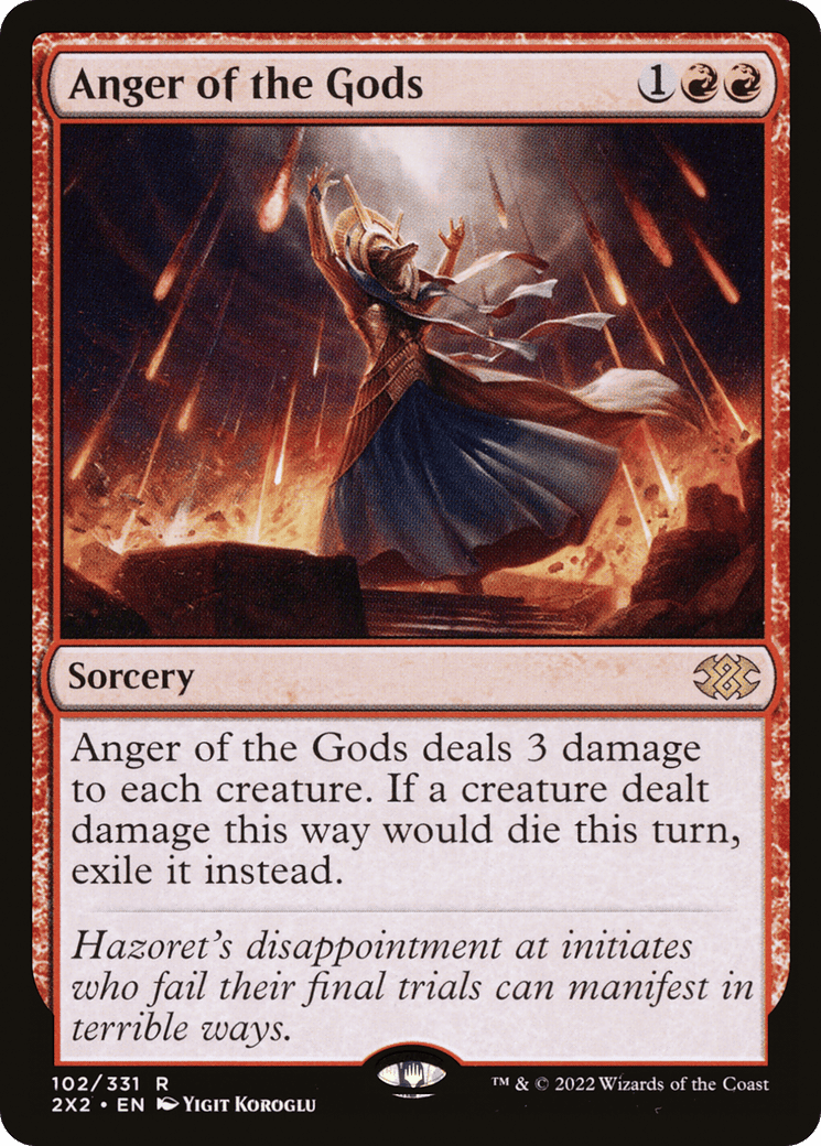 Anger of the Gods deals 3 damage to each creature. If a creature dealt damage this way would die this turn, exile it instead.