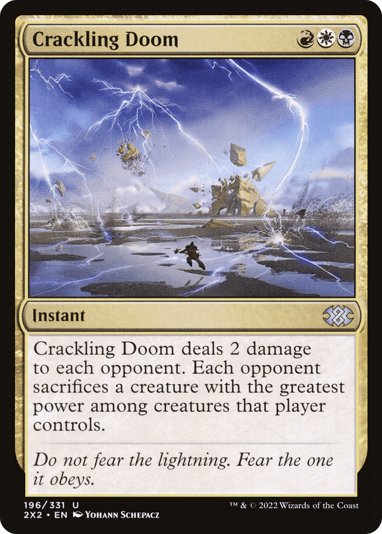 Crackling Doom deals 2 damage to each opponent. Each opponent sacrifices a creature with the greatest power among creatures that player controls.