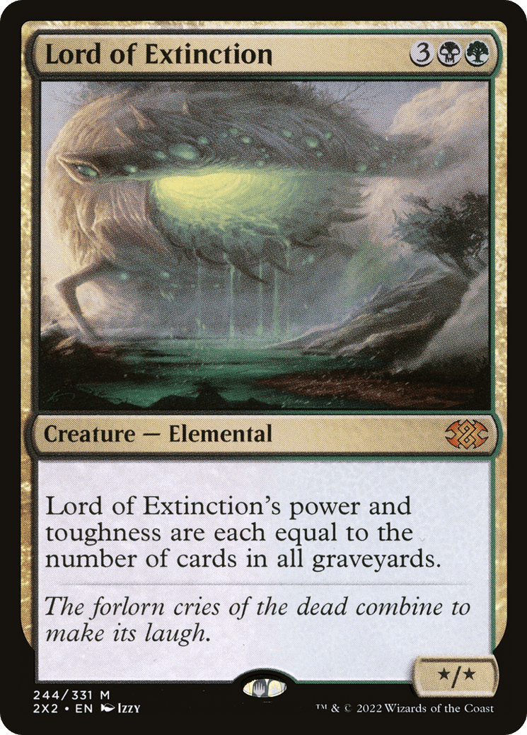 Lord of Extinction’s power and toughness are each equal to the number of cards in all graveyards.