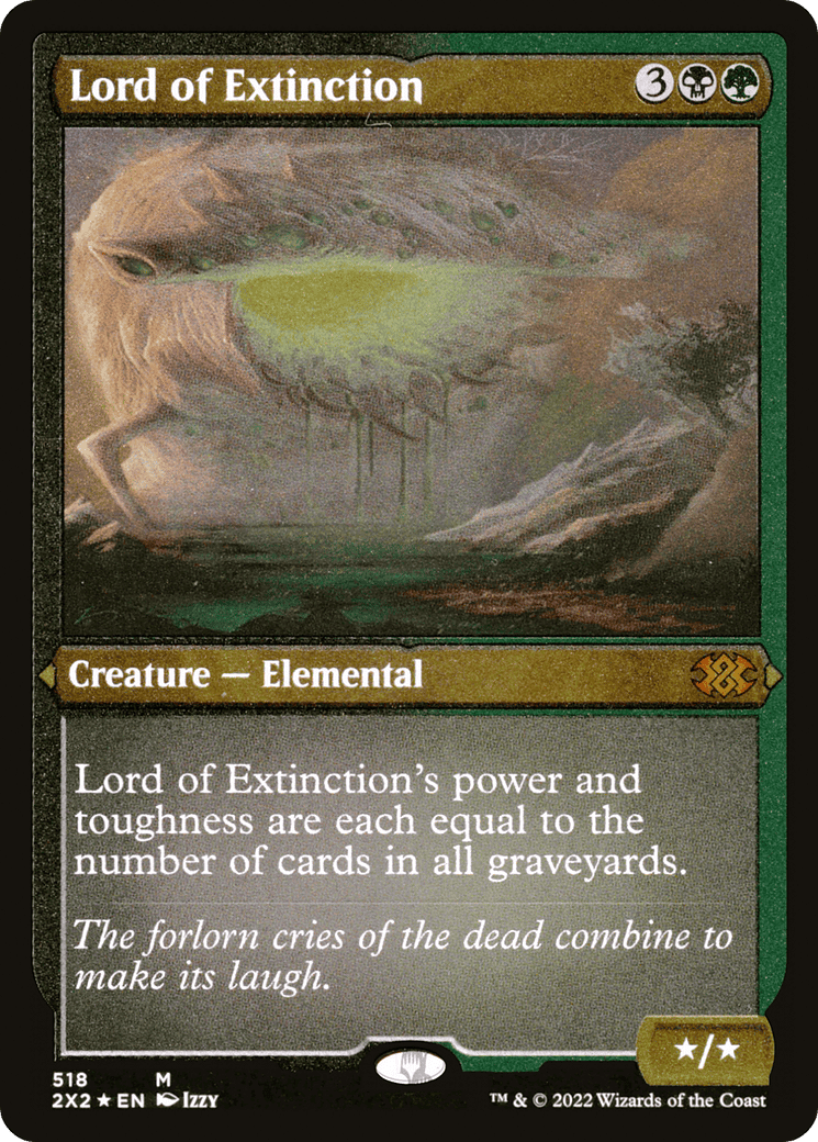 Lord of Extinction’s power and toughness are each equal to the number of cards in all graveyards.