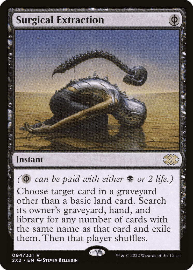 Choose target card in a graveyard other than a basic land card. Search its owner’s graveyard, hand, and library for any number of cards with the same name as that card and exile them. Then that player shuffle