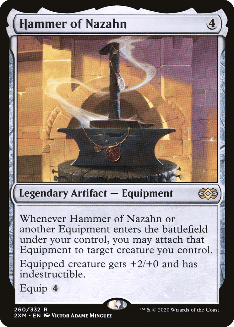 Whenever Hammer of Nazahn or another Equipment you control enters, you may attach that Equipment to target creature you control.