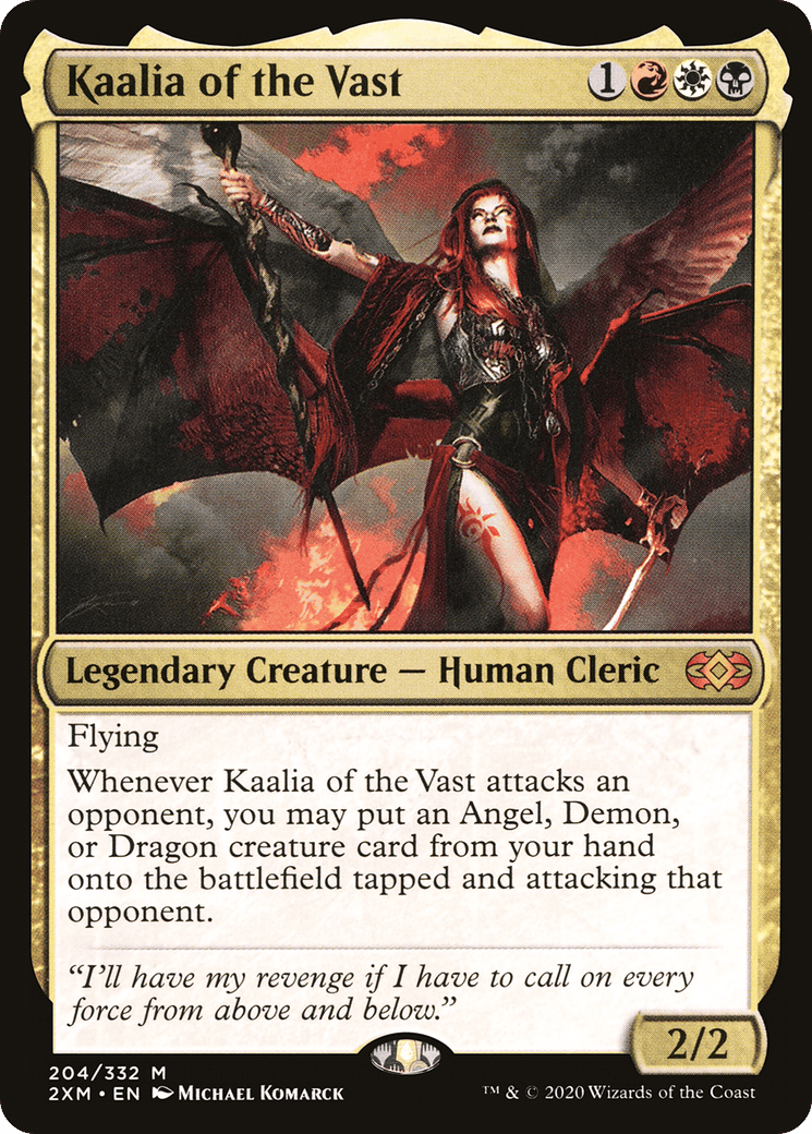 Whenever Kaalia attacks an opponent, you may put an Angel, Demon, or Dragon creature card from your hand onto the battlefield tapped and attacking that opponent.