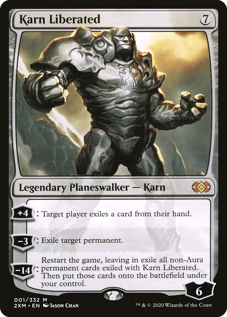 −14: Restart the game, leaving in exile all non-Aura permanent cards exiled with Karn. Then put those cards onto the battlefield under your control.