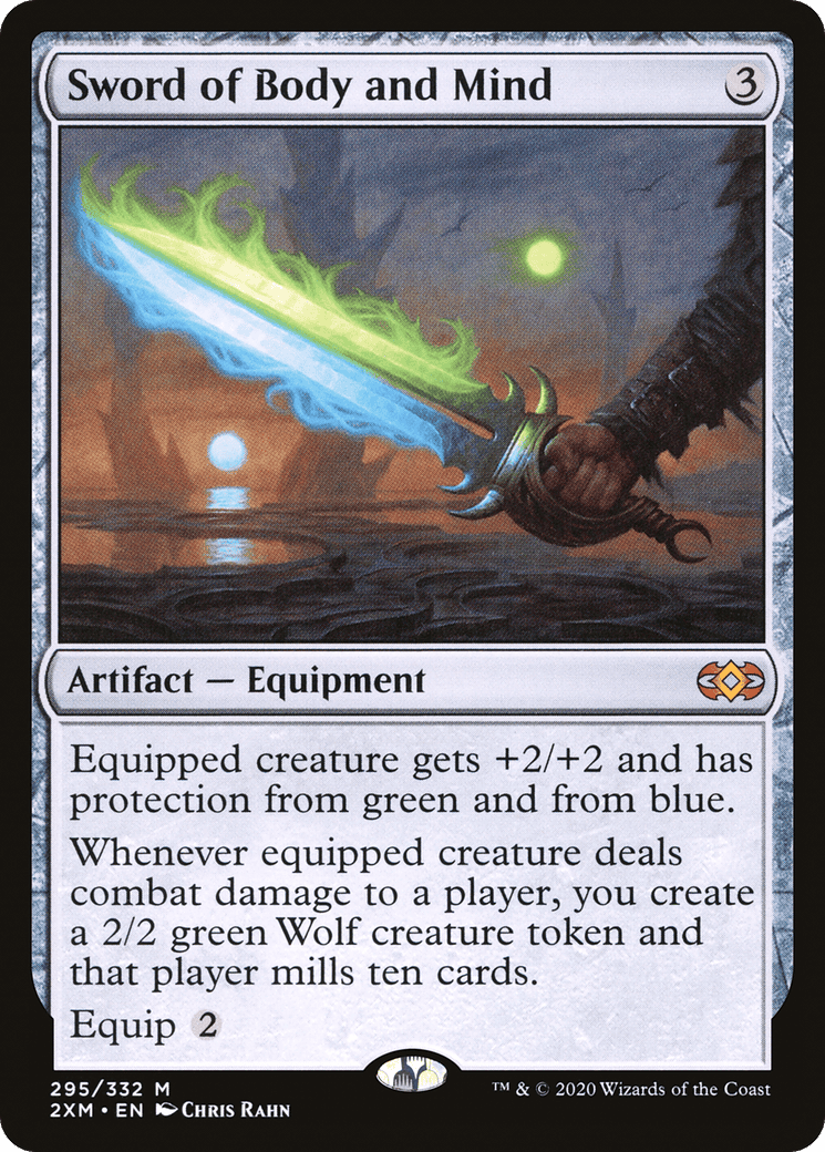 Whenever equipped creature deals combat damage to a player, you create a 2/2 green Wolf creature token and that player mills ten cards.