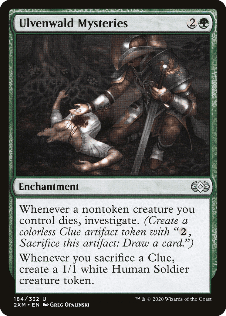 Whenever a nontoken creature you control dies, investigate. (Create a Clue token. It’s an artifact with “{2}, Sacrifice this token: Draw a card.”)