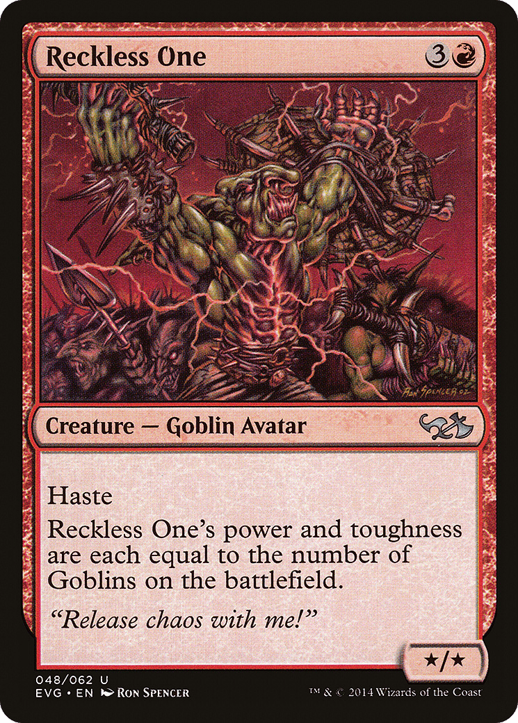 Haste Reckless One’s power and toughness are each equal to the number of Goblins on the battlefield.