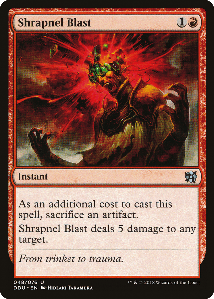 As an additional cost to cast this spell, sacrifice an artifact. Shrapnel Blast deals 5 damage to any target.