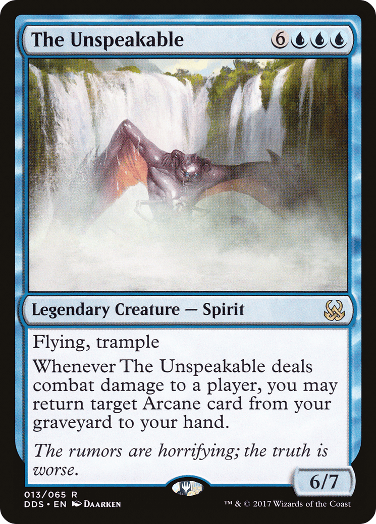 Whenever The Unspeakable deals combat damage to a player, you may return target Arcane card from your graveyard to your hand.