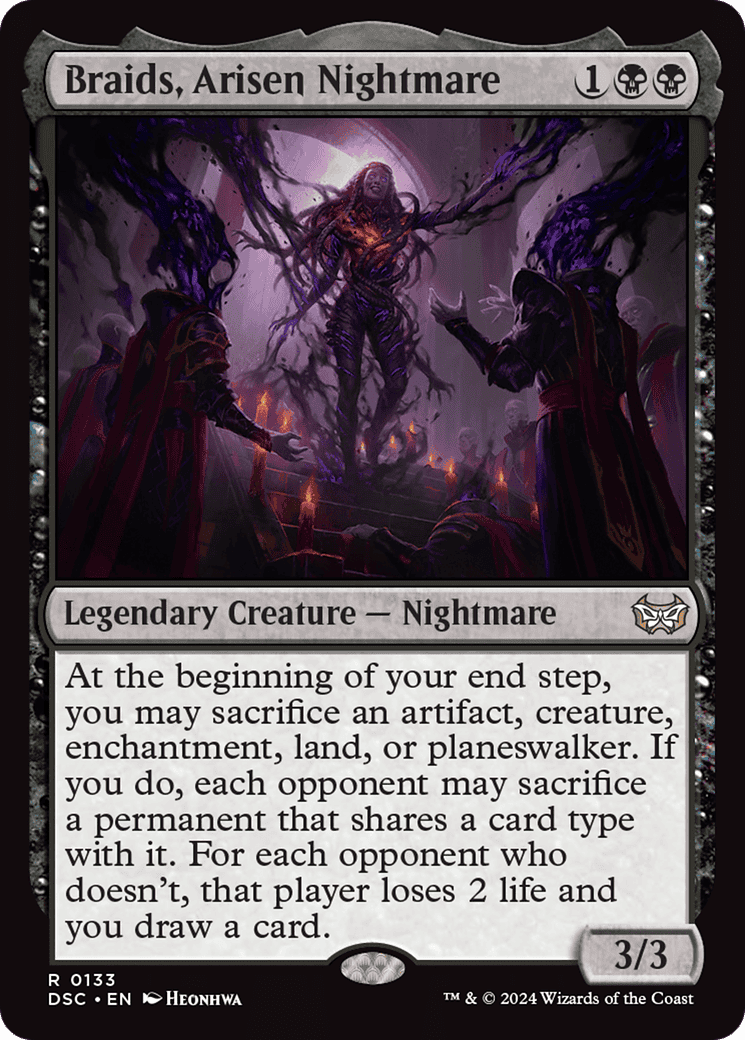 At the beginning of your end step, you may sacrifice an artifact, creature, enchantment, land, or planeswalker. If you do, each opponent may sacrifice a permanent of their choice that shares a card type with it. For each opponent who doesn’t, that player