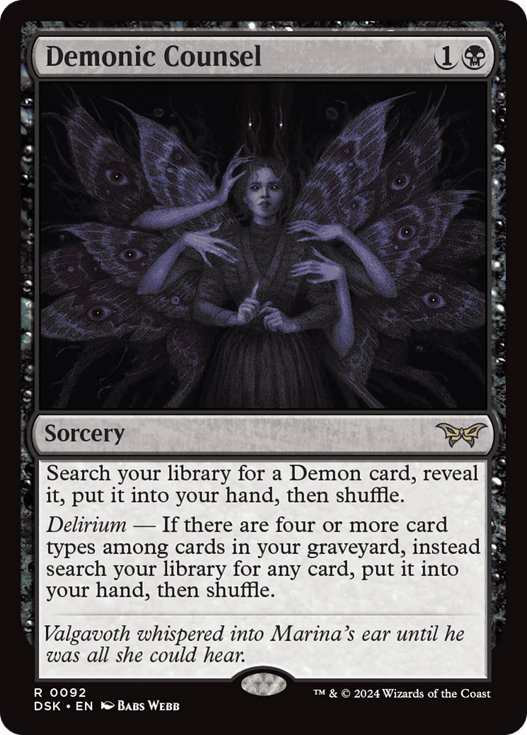 Delirium – If there are four or more card types among cards in your graveyard, instead search your library for any card, put it into your hand, then shuffle.
