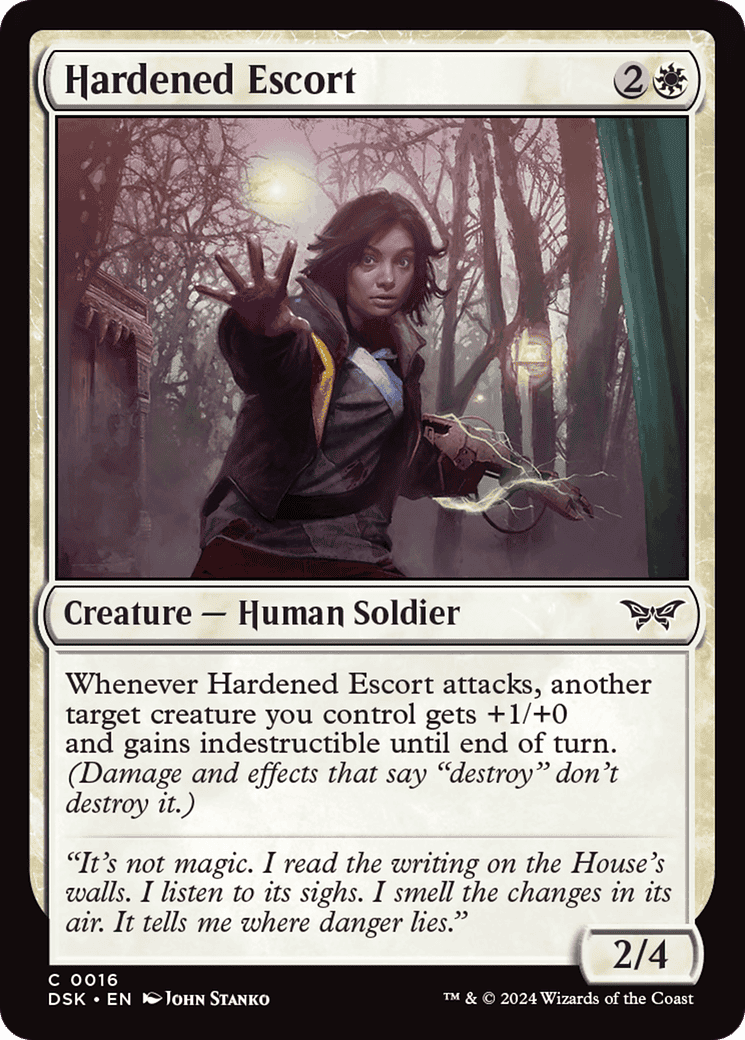Whenever this creature attacks, another target creature you control gets +1/+0 and gains indestructible until end of turn. (Damage and effects that say “destroy” don’t destroy it.)