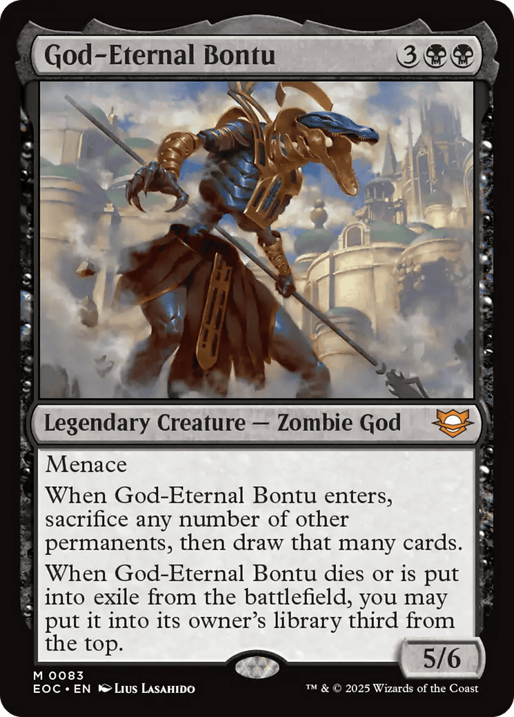 When God-Eternal Bontu enters, sacrifice any number of other permanents, then draw that many cards.