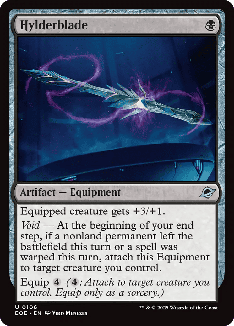 Void – At the beginning of your end step, if a nonland permanent left the battlefield this turn or a spell was warped this turn, attach this Equipment to target creature you control.