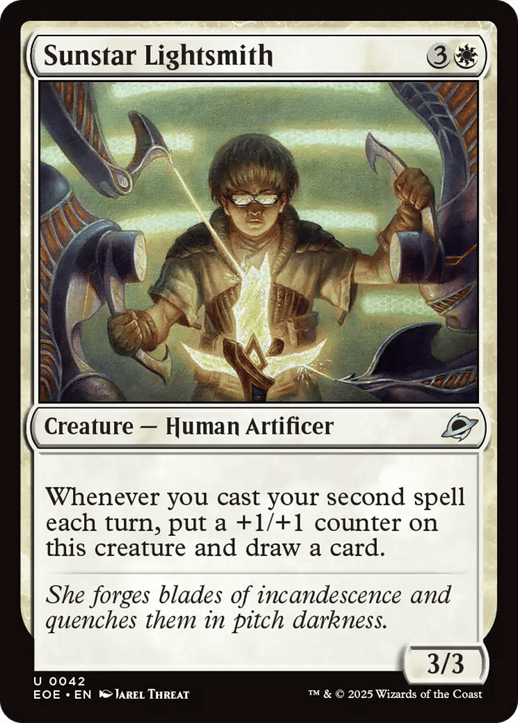 Whenever you cast your second spell each turn, put a +1/+1 counter on this creature and draw a card.