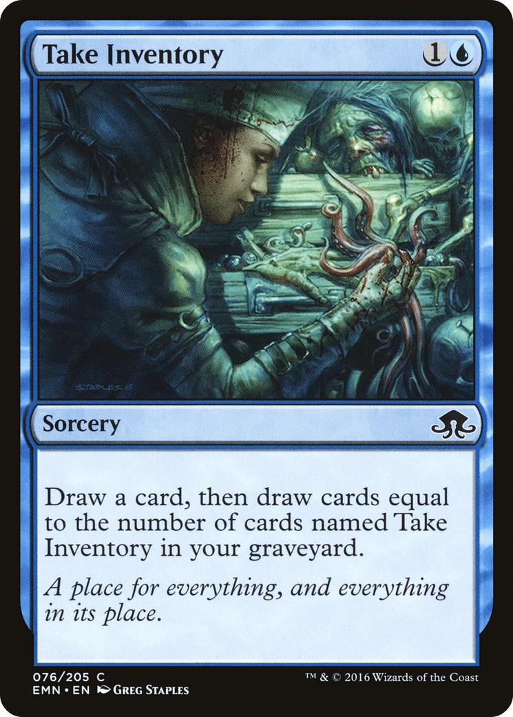Draw a card, then draw cards equal to the number of cards named Take Inventory in your graveyard.