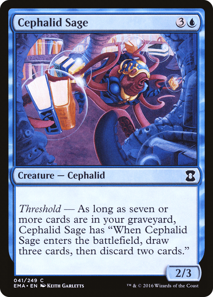 Threshold – As long as seven or more cards are in your graveyard, this creature has “When this creature enters, draw three cards, then discard two cards.”