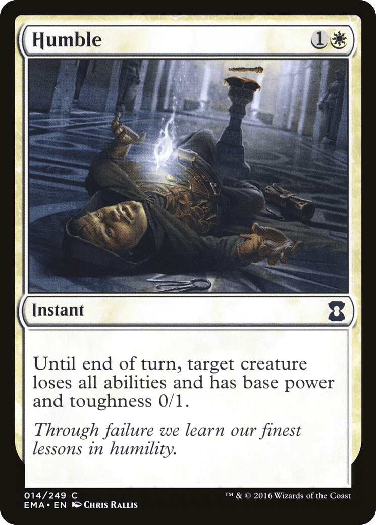 Until end of turn, target creature loses all abilities and has base power and toughness 0/1.