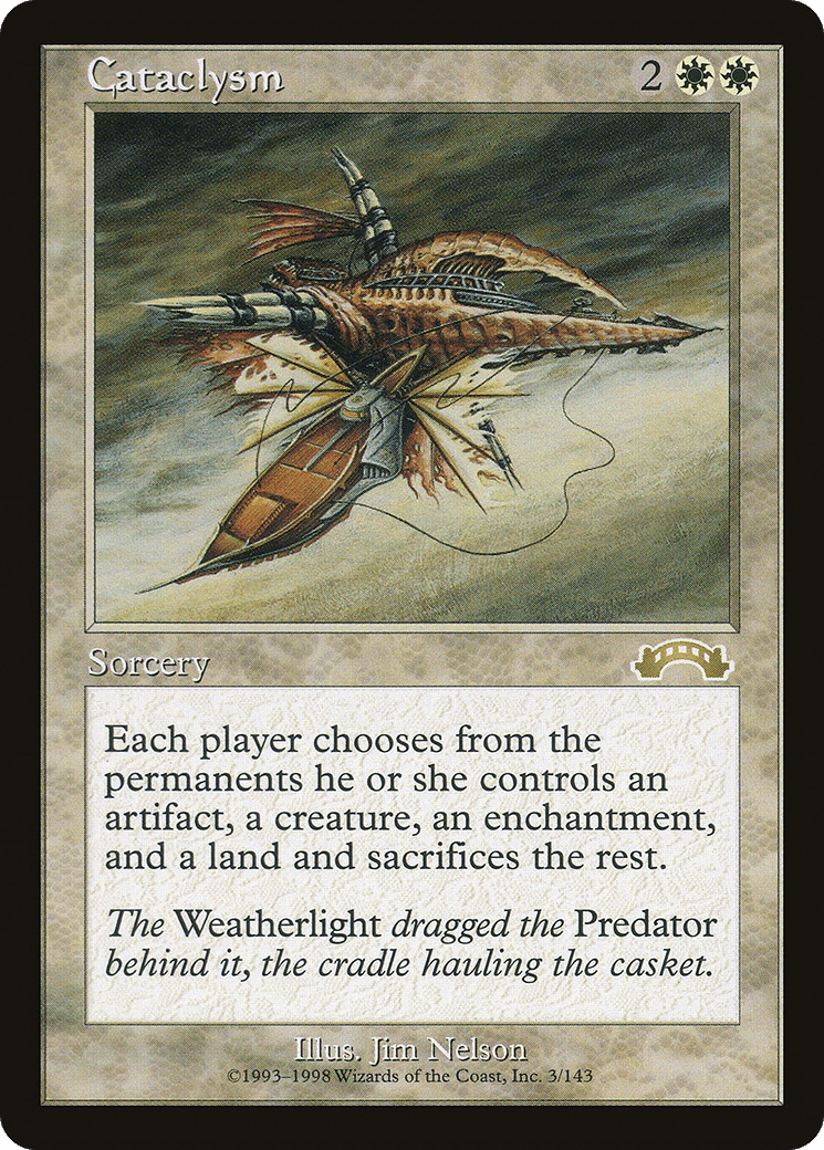Each player chooses from among the permanents they control an artifact, a creature, an enchantment, and a land, then sacrifices the rest.