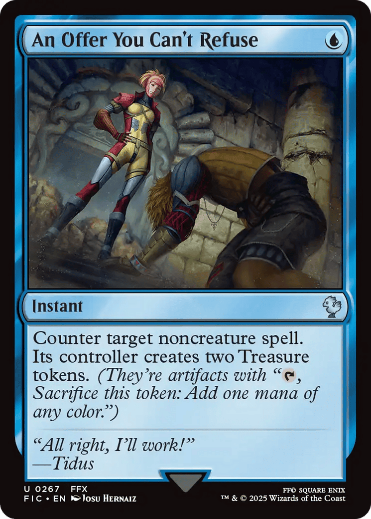 Counter target noncreature spell. Its controller creates two Treasure tokens. (They’re artifacts with “{T}, Sacrifice this token: Add one mana of any color.”)