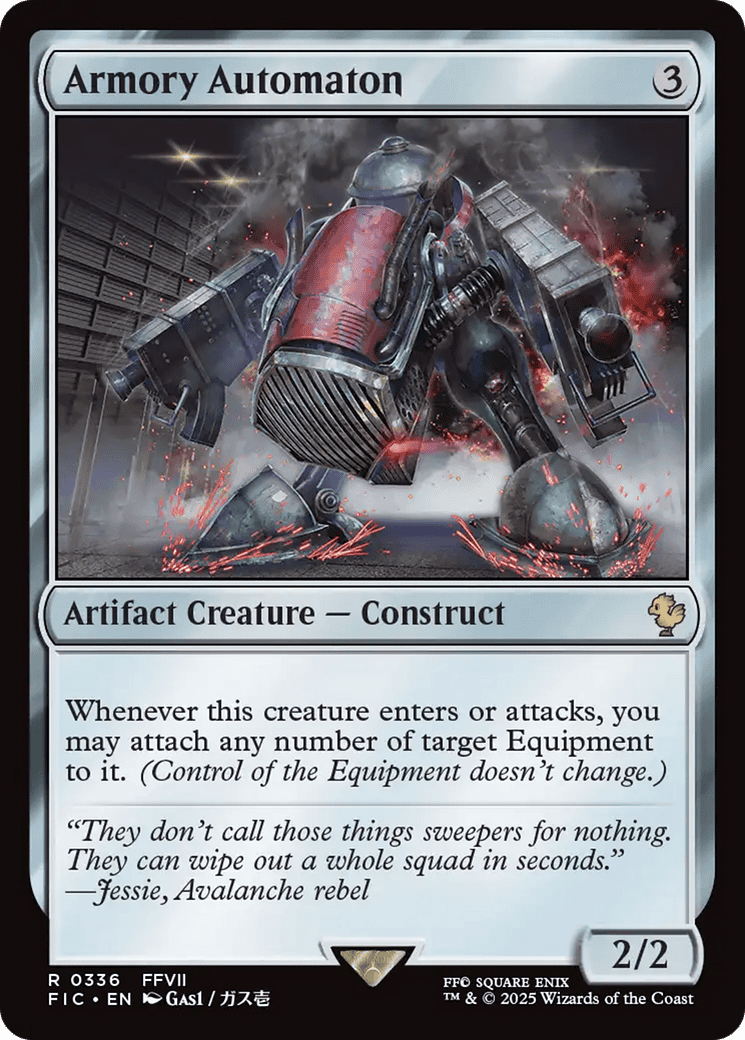 Whenever this creature enters or attacks, you may attach any number of target Equipment to it. (Control of the Equipment doesn’t change.)