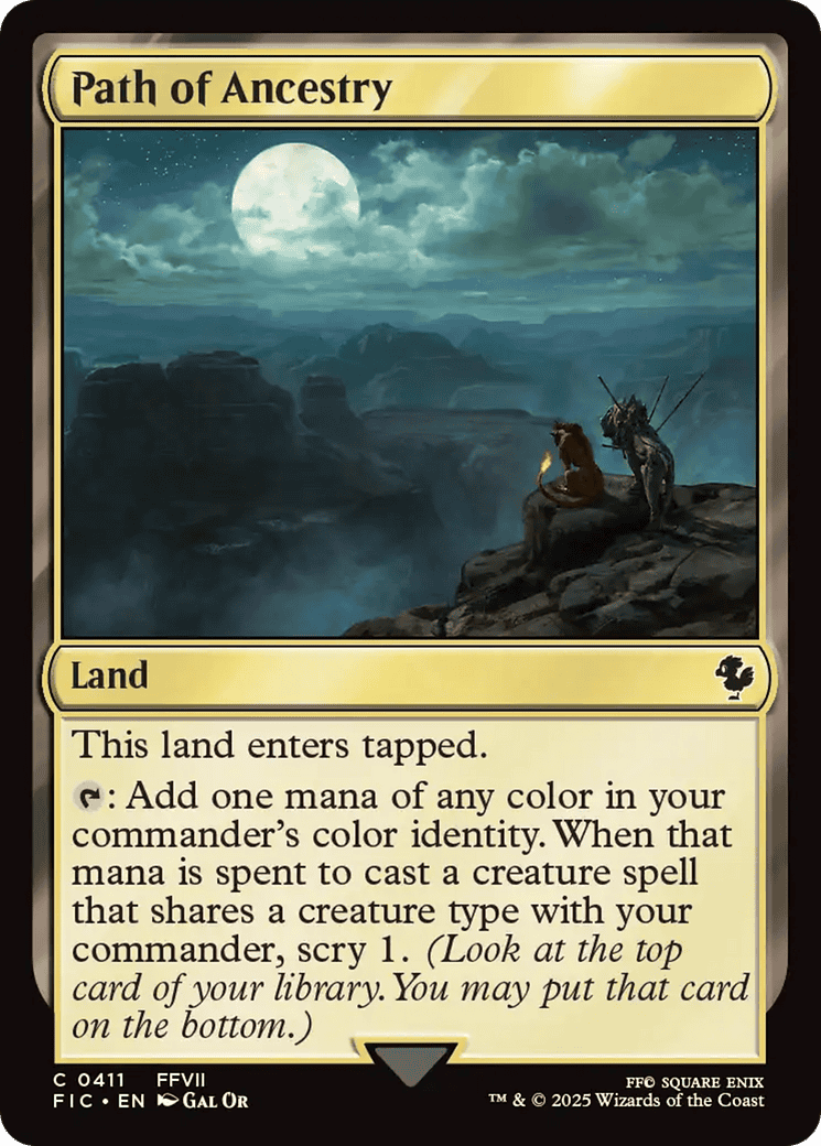 {T}: Add one mana of any color in your commander’s color identity. When that mana is spent to cast a creature spell that shares a creature type with your commander, scry 1. (Look at the top card of your library. You may put that c