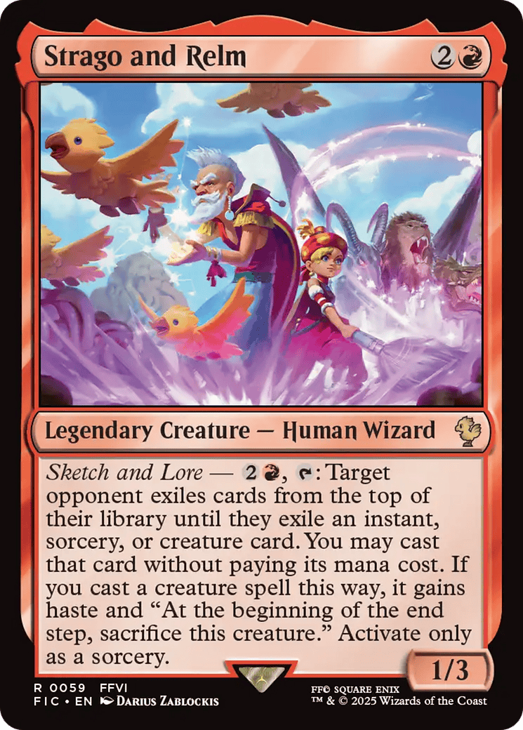 Sketch and Lore – {2}{R}, {T}: Target opponent exiles cards from the top of their library until they exile an instant, sorcery, or creature card. You may cast that card without paying its mana cost. If you cast a creature spell this way, it gains haste an
