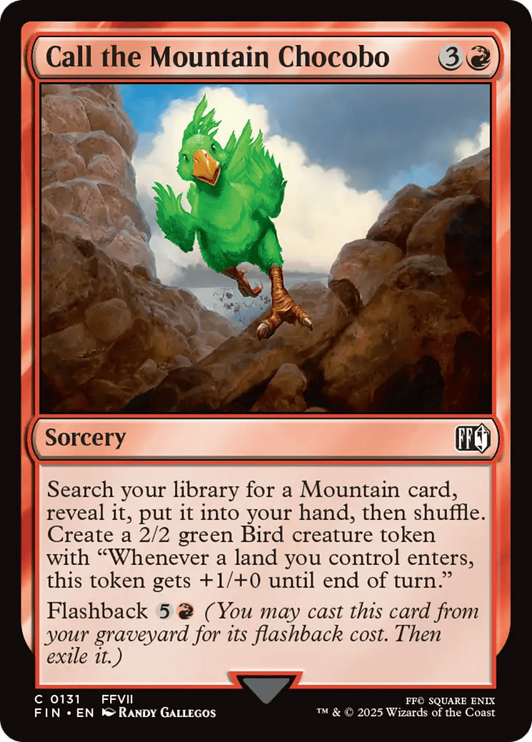 Search your library for a Mountain card, reveal it, put it into your hand, then shuffle. Create a 2/2 green Bird creature token with “Whenever a land you control enters, this token gets +1/+0 until end of turn.”