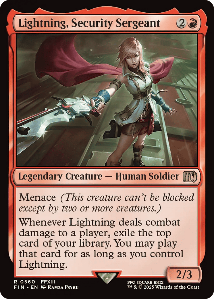 Whenever Lightning deals combat damage to a player, exile the top card of your library. You may play that card for as long as you control Lightning.