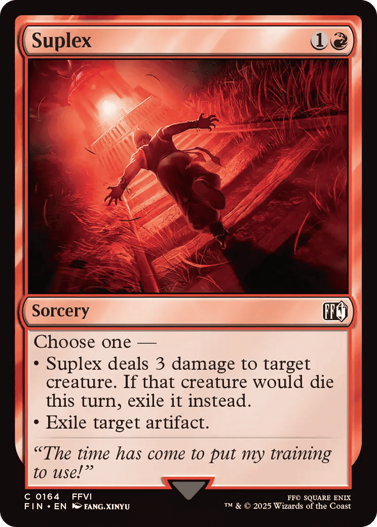 Choose one – – Suplex deals 3 damage to target creature. If that creature would die this turn, exile it instead. – Exile target artifact.