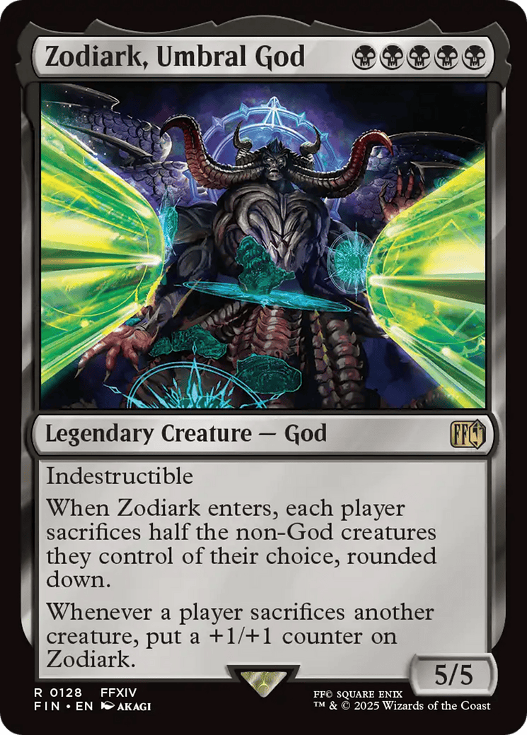 When Zodiark enters, each player sacrifices half the non-God creatures they control of their choice, rounded down.