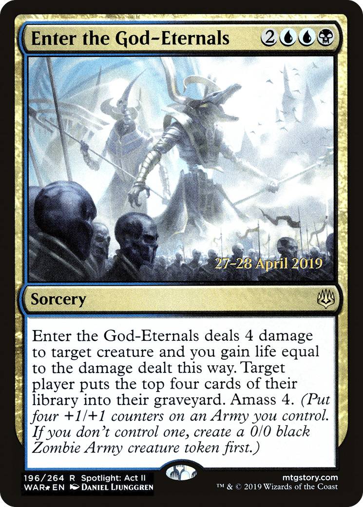 Enter the God-Eternals deals 4 damage to target creature and you gain life equal to the damage dealt this way. Target player mills four cards. Amass Zombies 4. (Put four +1/+1 counters on an Army you control. It’s also a Zombie. If you don’t control an Ar